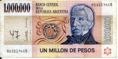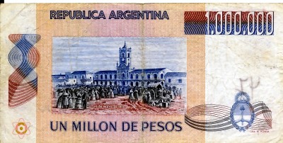 This banknote was issued for 1,000,000 Peso Ley which was Argentina's currency for a number of years until 1983, when the Peso Ley was replaced by the Peso Argentino at a rate of 10,000 to 1. In 1985, the Peso Argentino was replaced by the Austral at the rate of 10,000 to 1. In 1992, the Austral was replaced by the Peso Convertible at a rate of 10,000 to 1. For a number of years the Peso Convertible was on par with the U.S. dollar, but today trades at a bit over 3 to 1. I carefully muliplied this out and today it would take 3,000,000,000,000,000,000 Peso Ley to equal one US dollar. Clearly this bill would not buy me lunch at Olive Garden in Reynoldsburg. |