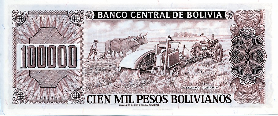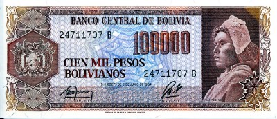 At the beginning of 1982 the Bolivian Peso was worth 25 to the US dollar. Three years later it was about 2,300 to the U.S. dollar. Then things got bad. When I arrived in Bolivia in early June 1985, the peso was trading at 320,000 to the U.S. dollar. A week later the rate was 520,000 to 1, before recovering a few days later to a 500,000 to 1 rate. Because the money was losing value so fast, the government was having a hard time printing currency fast enough. The largest bill in circulation was the 100,000 peso bill. We would exchange a US $20 bill and get 100 of 100,000 peso bills to stuff into our pocket. Then we would go down the street and buy a soft drink for 70,000 pesos, paying with a 100,000 peso bill. However, there was a shortage of bills of 5,000 and 10,000 pesos. So, we would get back 30 bills of 1000 pesos in change, each of which was worth one-fifth of one US cent. Sometimes there wouldn't be enough 1000 pesos bills and we would get some 500 peso bills also. By September, the exchange had passed 1,000,000 to 1 and finally bottomed out at around 2,000,000 to 1 around the end of the year. In 1986, Bolivia issued a new currency called the Boliviano at a rate of 1 to 1,000,000 of the old pesos, or 2 to 1 US dollar. Since then Bolivia has closely managed its economy by letting its people slide further into poverty as "recommended" by the IMF. Currently the exchange rate is 7 Bolivianos to one US dollar. Just six months ago, it was around 7.5 to 1, so it is not just Euros and Canadian dollars that are gaining on the US dollar. |
